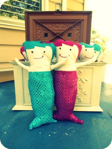 I made mermaid dolls for all the little girls to take home--my wonderful mother-in-law embroidered the faces for me. They weren't the most fun thing I've ever made, but they turned out cute, and they were a hit when I handed them out!